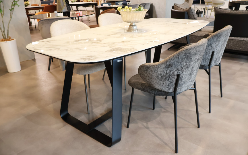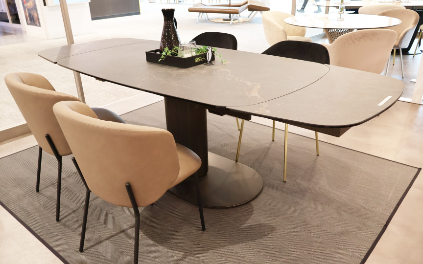 大理石を模したセラミック天板と立体的な脚のデザインが特徴的な、スタイリッシュで機能的な伸長式ダイニングテーブルです